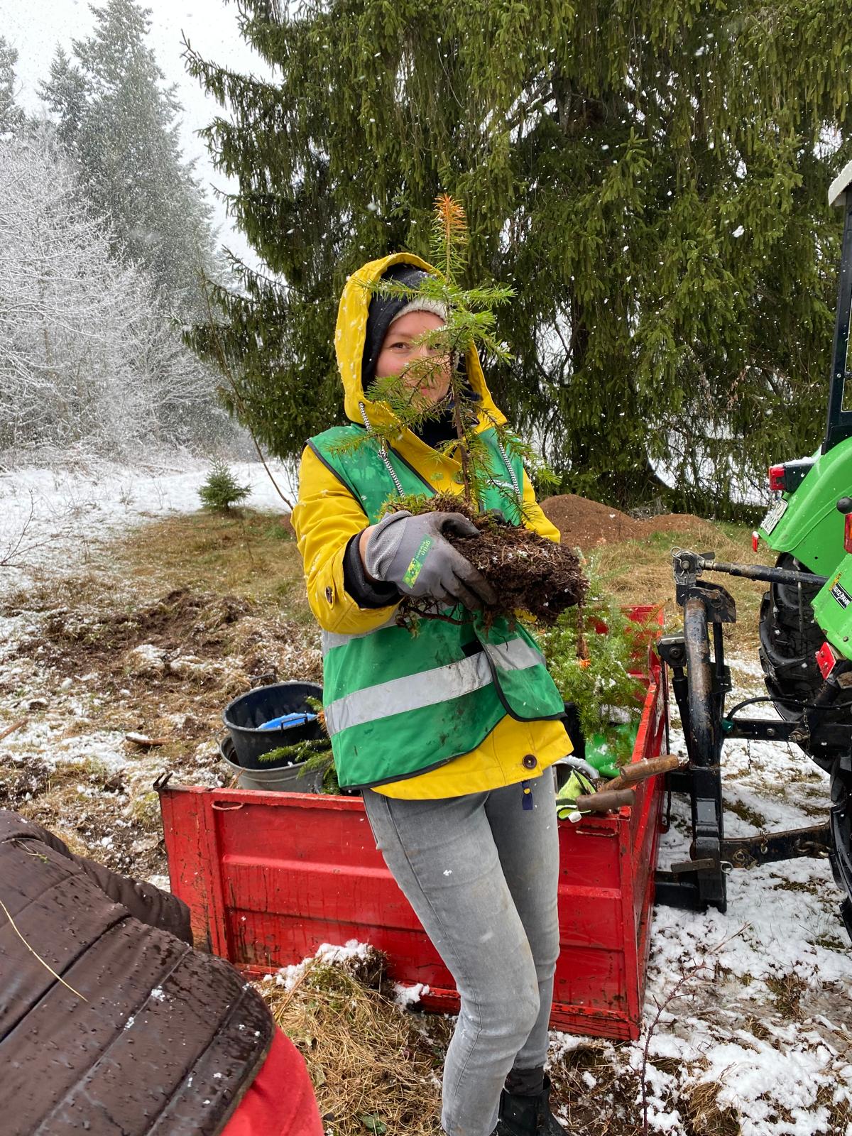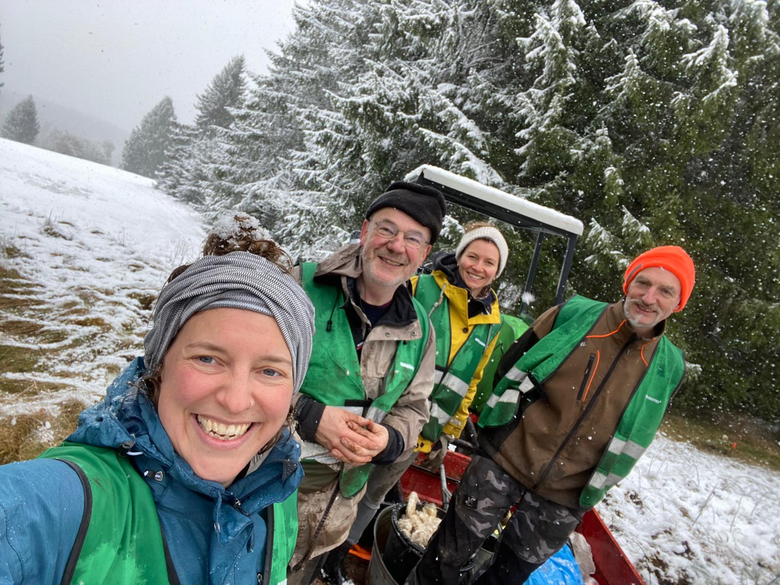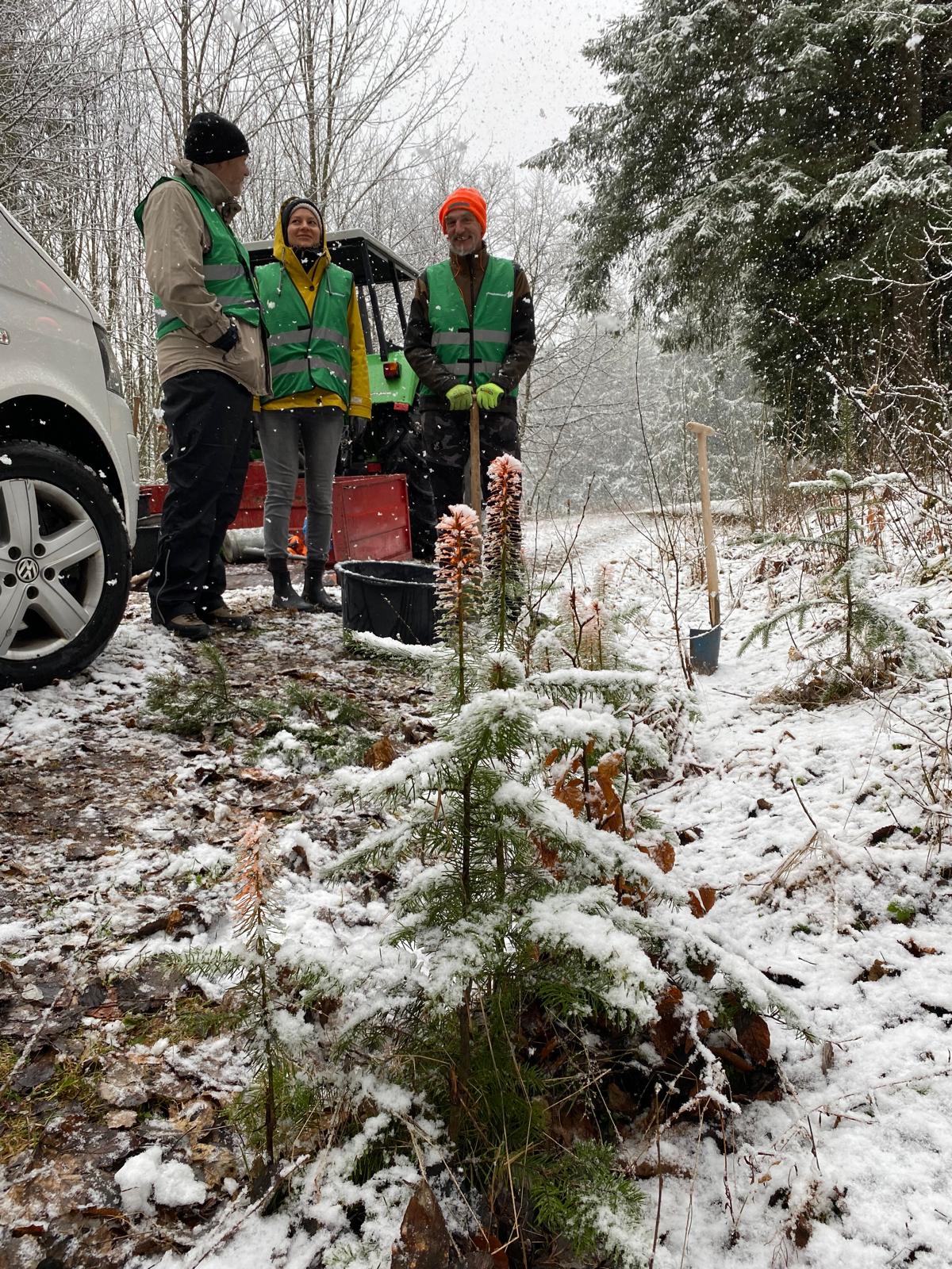 Mit dem plötzlichen Wintereinburch nach frühfrühlinghaften Wochen hatten wir nun wirklich nicht gerechnet. Doch getreu dem Motto "Es gibt kein schlechtes Wetter, nur die falsche Kleidung" sind wir in dezimierter Gruppenstärke tapfer dennoch ausgerückt. Gemeinsam mit den Psychologists for future sind wir von Freiburg ins winterliche Lenzkirch angereist um unter tanzenden Schneeflocken fröhlich Douglasien am Wegesrand auszubuddeln. Gemeinsam mit Waldbesitzer Tom und nach Absprache mit der Revierförsterin, die uns die zu verpflanzenden Bäumchen schon markiert hatte, haben wir im Anschluss rund 50 Douglasien in den angrenzenden Wald verpflanzt wo sie nun weiter wachsen können. Die Kälte zeigte ihre Wirkung: Wir arbeiteten flott, in nur wenigen Stunden waren wir feritg und freuten uns über warmes Süppchen und Kachelofen im gemütlichen Schwarzwaldhaus. Ein sehr gelungener letzer Baumtag für diese Saison - Danke Tom für Gastfreundschaft & deinen Einsatz für Mehr Bäume Jetzt!